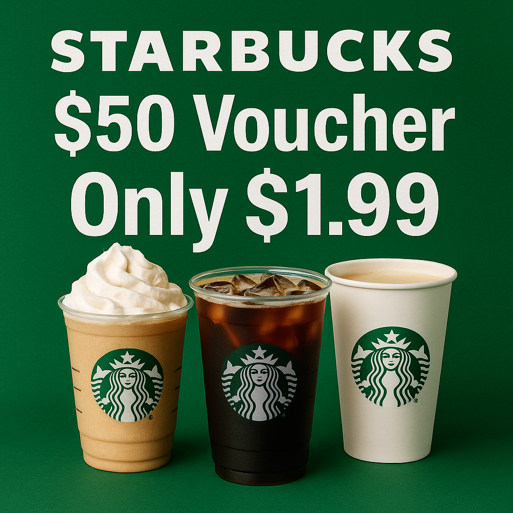 Get a $50 Starbucks voucher for just $1.99 and enjoy huge savings on your favourite drinks and treats. Redeem easily through the Starbucks App or website. Your coupon code and full instructions will be delivered directly to your email within 24 hours